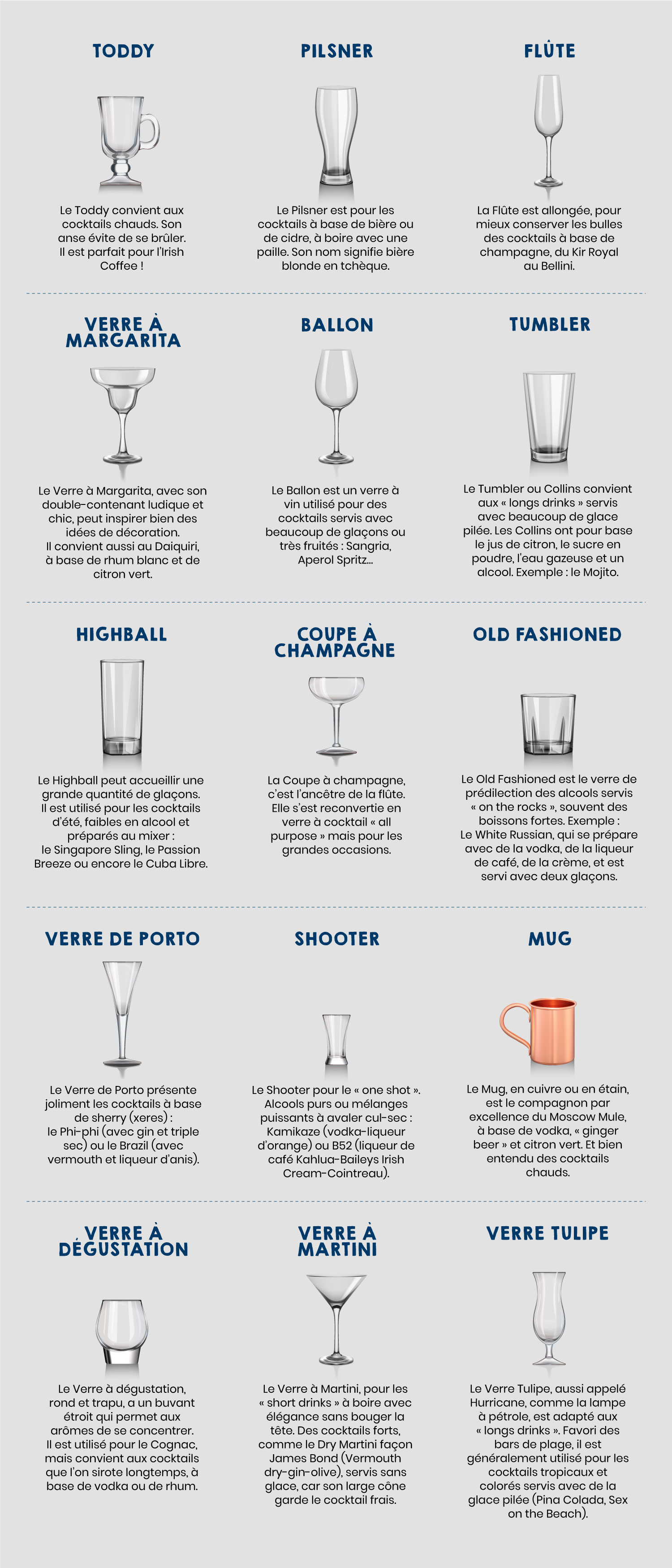 Il faut d’abord savoir que la forme du verre a une fonction technique précise. Les verres à la forme arrondie, par exemple, permettent une meilleure concentration des arômes des alcools forts. Les verres longs et étroits maintiennent les glaçons en surface. Les verres à tige évitent qu’en tenant le contenant, on ne réchauffe l’alcool. Ceux qui ont un fond épais permettent d’écraser le sucre et les fruits.