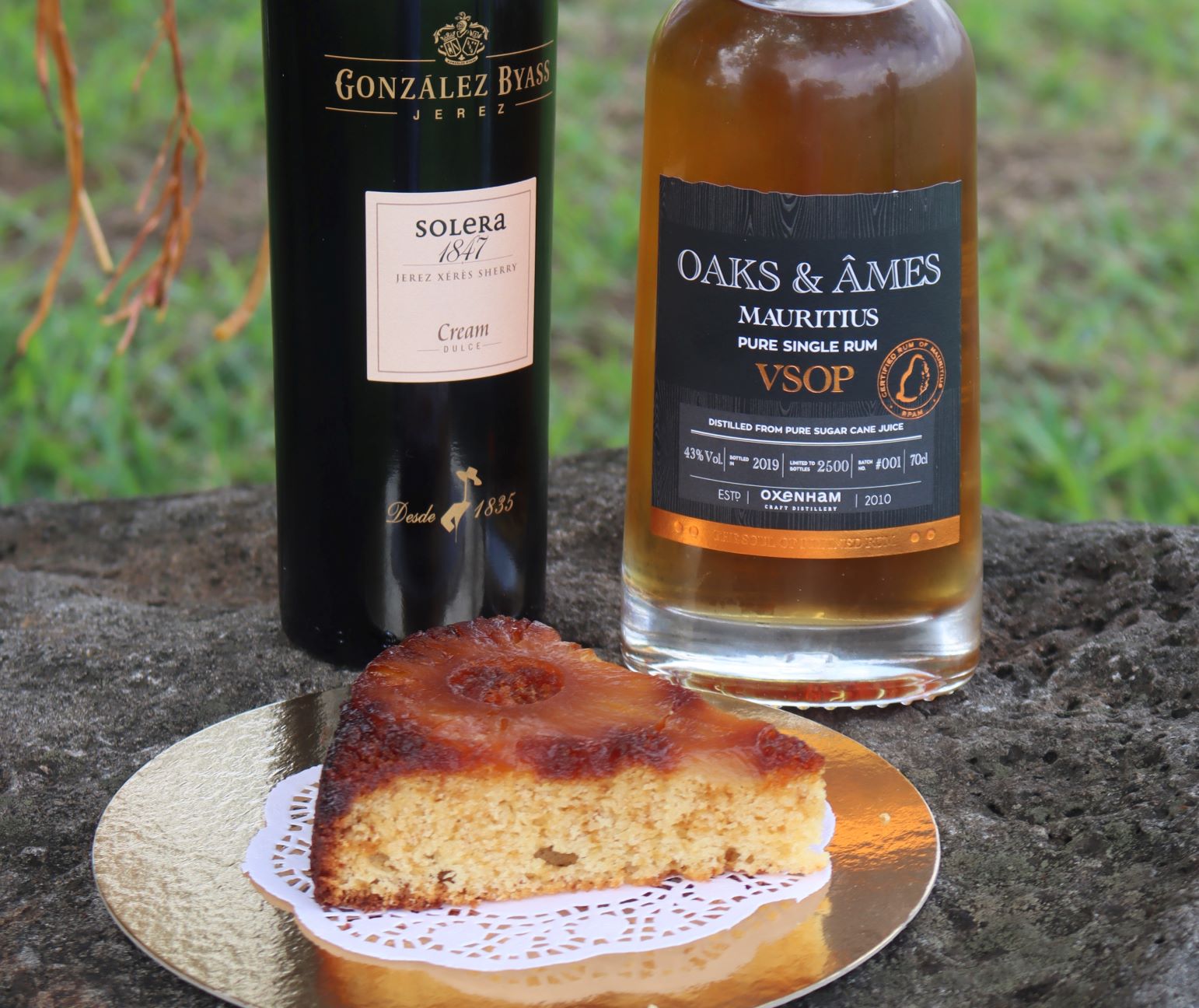 On le retrouve aux Antilles, au Maroc, à Madagascar, au Mexique… Frederica en a toujours vu dans la cuisine de sa grand-mère. Pour Mervin, rien ne complète mieux le beau duo caramel-fruit tropical du gâteau renversé à l’ananas que le rhum de jus de canne. Il a choisi le plus noble de notre sélection : Oaks&Ames VSOP. Elevé quatre ans en fût de chêne, ce prestigieux rhum a une si forte personnalité qu’il se déguste tout seul. Mais il a bien des choses en commun avec ce gâteau rustique, spongieux et caramélisé. Il est sec, exotique, gourmand...